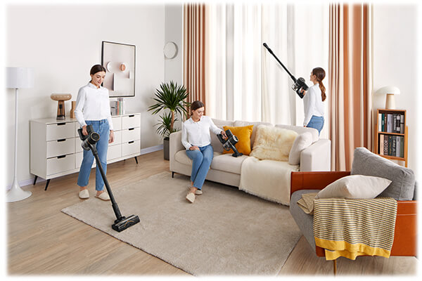Удобный механизм позволяет одним движением снять одну насадку и так же быстро установить другую — переключайтесь с уборки пола на чистку дивана и обратно за считанные секунды.