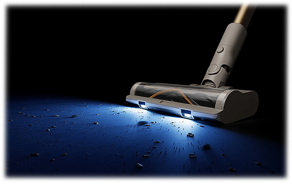 В насадке аккумуляторного пылесоса Dreame U20 имеется встроенная спереди световая подсветка, для уборки при плохом освещении и в темных уголках дома. Убирайте даже там, где не видите.