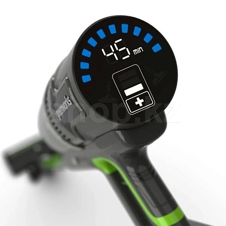 Пылесос Greenworks оснащён удобным LED-дисплеем с сенсорным управлением тремя режимами мощности, с индикацией уровня заряда аккумуляторной батареи и временем работы в выбранном режиме.
