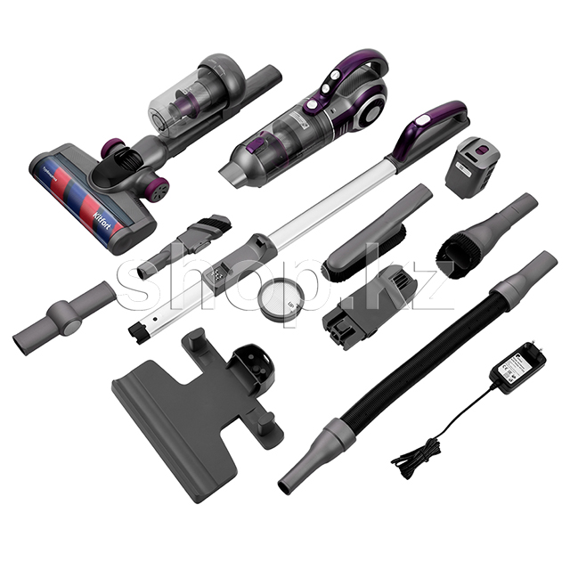 Съёмный ручной пылесос с пылесборником, корпус пылесоса с блоком щётки и основным пылесборником, аккумуляторная батарея, зарядное устройство, насадка «2 в 1», насадка для дивана «2 в 1», мягкая щётка, соединитель, удлинительный шланг.