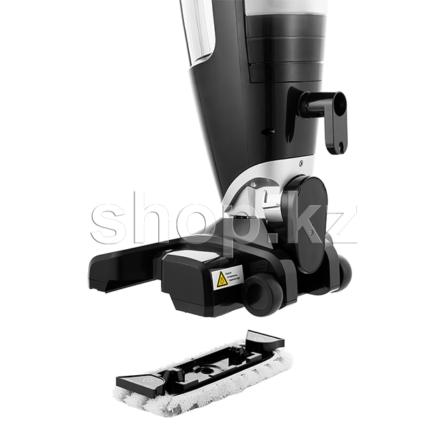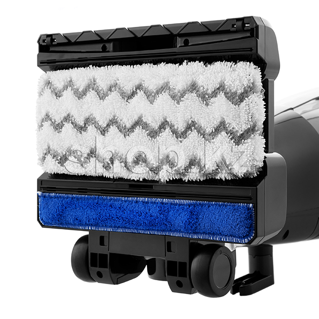 Пылесос манёвренный благодаря колёсикам и специальной конструкции щётки для пола. На щётку прибора крепится на липучках узкая тряпка, которая вытирает лишнюю влагу от основной тряпки.