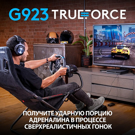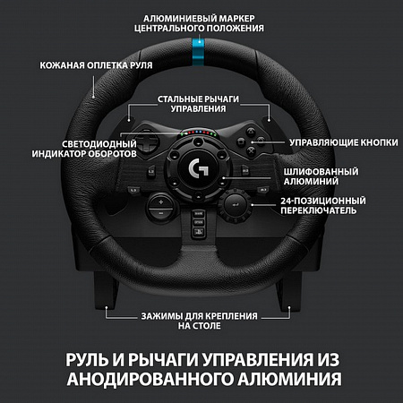 Усовершенствованный классический дизайн. Благодаря обновленной цветовой гамме, первоклассному шлифованному металлу, автомобильному кожаному покрытию и педалям из полированной стали игровой руль G923 не отличить от настоящего. Форма соответствует наполнению — оцените преимущества встроенного маркера центрального положения и дискового регулятора.