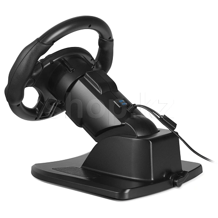 Для удобного хвата руль оснащен резиновыми вставками, еще больший уровень комфорта достигается за счет регулировки его наклона. Угол поворота руля может доходить до 900°, что позволяет использовать его даже в самых «продвинутых» симуляторах, максимально приближенных к реальному вождению. Дополнительные возможности управления игровым процессом предлагают программируемые кнопки. С их помощью можно осуществлять как базовые действия, такие как включение фар или сигнала клаксона, так и более сложные — в том числе, управлять игровым персонажем.
