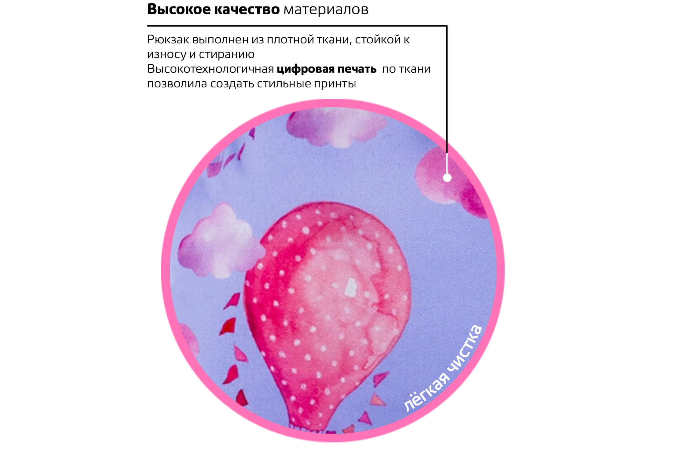 Рюкзак изготовлен из прочного качественного полиэстера, который легко чистится. Имеет уплотненную спинку и дно. В рюкзаке присутствует подкладка! Высокотехнологичная цифровая печать по ткани позволила получить яркие и насыщенные краски. Дизайн соответствует последним модным трендам!
