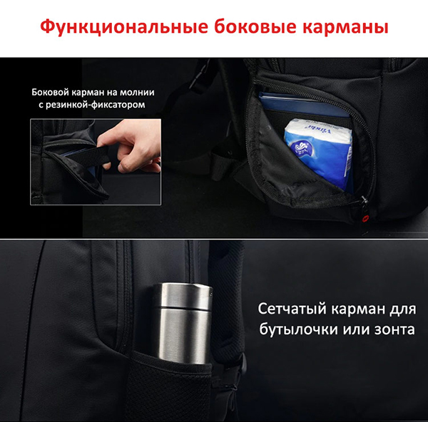для ручек, для мобильного телефона, для планшета, дополнительные отделения (документы, зарядное устройство и др.), карман для бутылки с напитком