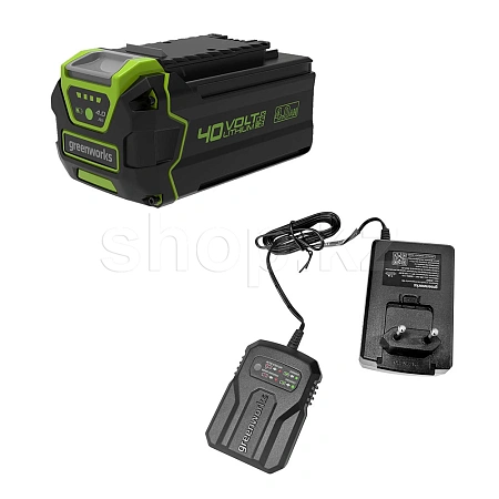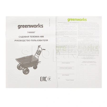 Тележка работает от аккумуляторной батареи G-MAX 40V (2 или 4 А/ч, в комплект не входит), которую можно использовать с другими устройствами GreenWorks из линейки техники 40 вольт.
