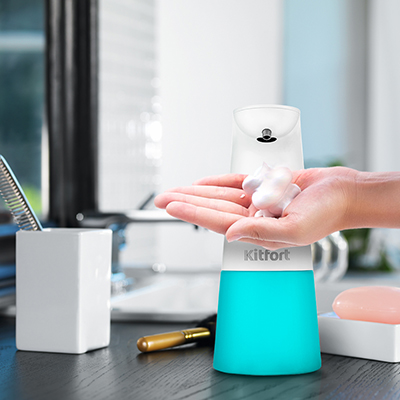 Инфракрасный сенсор и световая индикация Диспенсер автоматически подаёт мыльную пену при срабатывании инфракрасного датчика, реагирующего на приближение. При поднесении к нему руки на расстоянии до 5 см, сенсор выдаст порцию взбитой пены. Световая индикация сообщит о скорой замене батареек. |