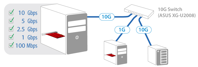 Специально для пользователей, которым требуется увеличенная пропускная способность проводной сети, компания ASUS предлагает XG-C100C – адаптер стандарта 10G Ethernet, обеспечивающий скорость передачи данных до 10 Гбит/с, что в 10 раз превышает возможности широко распространенных адаптеров Gigabit Ethernet.
