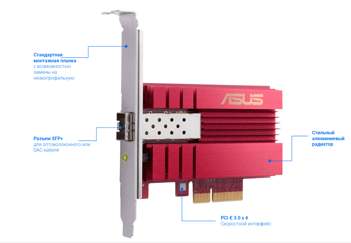 Контроллер ASUS XG-C100F поддерживает оптоволоконное подключение к сети, которое позволяет обеспечить высокую пропускную способность на расстояниях, существенно превышающих возможности традиционного медного интерфейса стандарта RJ-45.