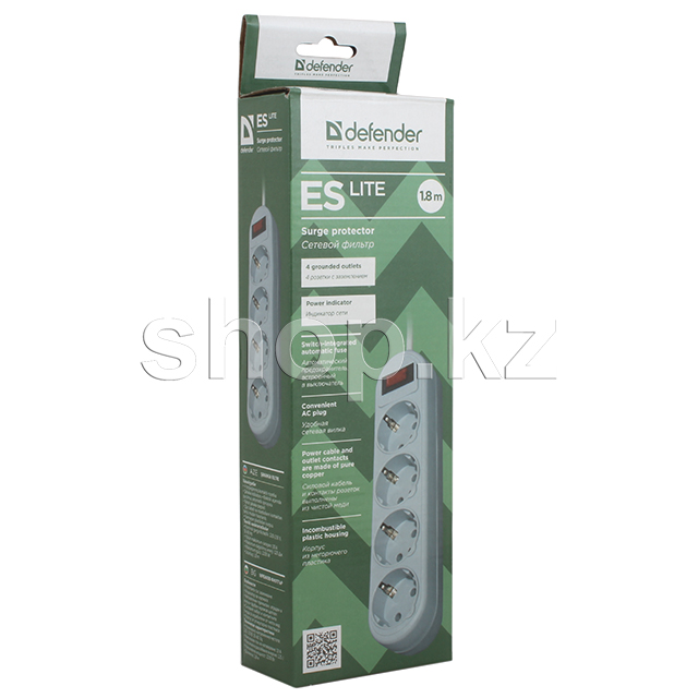 Сетевой фильтр Defender ES Lite, 4 розетки, 1.8м, Gray