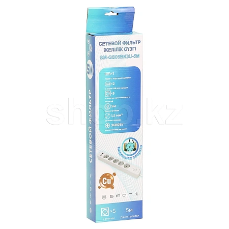 Сетевой фильтр SMART SM-GS05BK3U-5M, 5 розеток, 1хUSB Type-C, 2xUSB, 5м, White