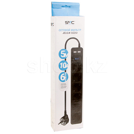 Сетевой фильтр SVC ZC6S-50M-USB, 6 розеток, 2xUSB, 5м, Black