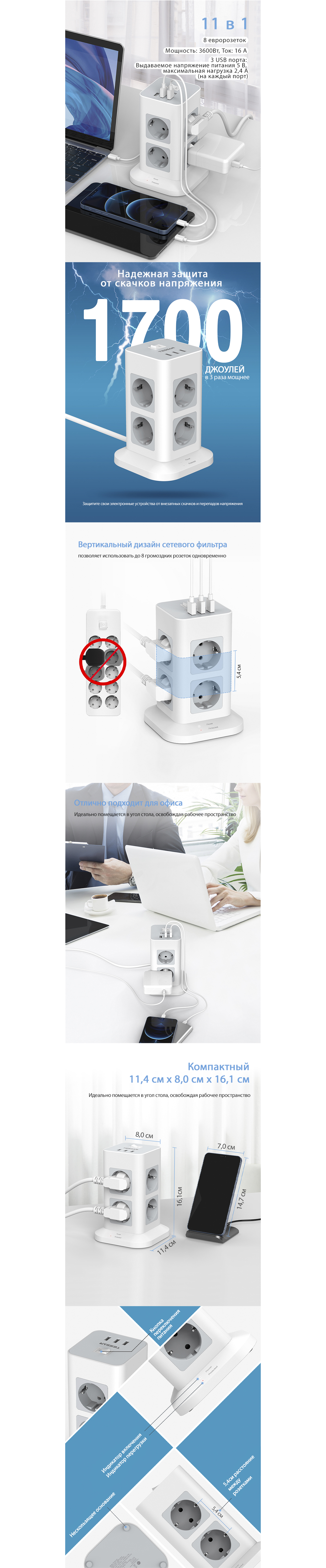 Сетевой фильтр с 8 розетками 220В, 3 USB портами и кнопкой питания. Компактный дизайн. LED индикаторы. Защита от перегрузки и скачков напряжения. Огнеупорный материал корпуса. Высококачественный медный кабель 2 метра. Надежные плотные разъёмы.