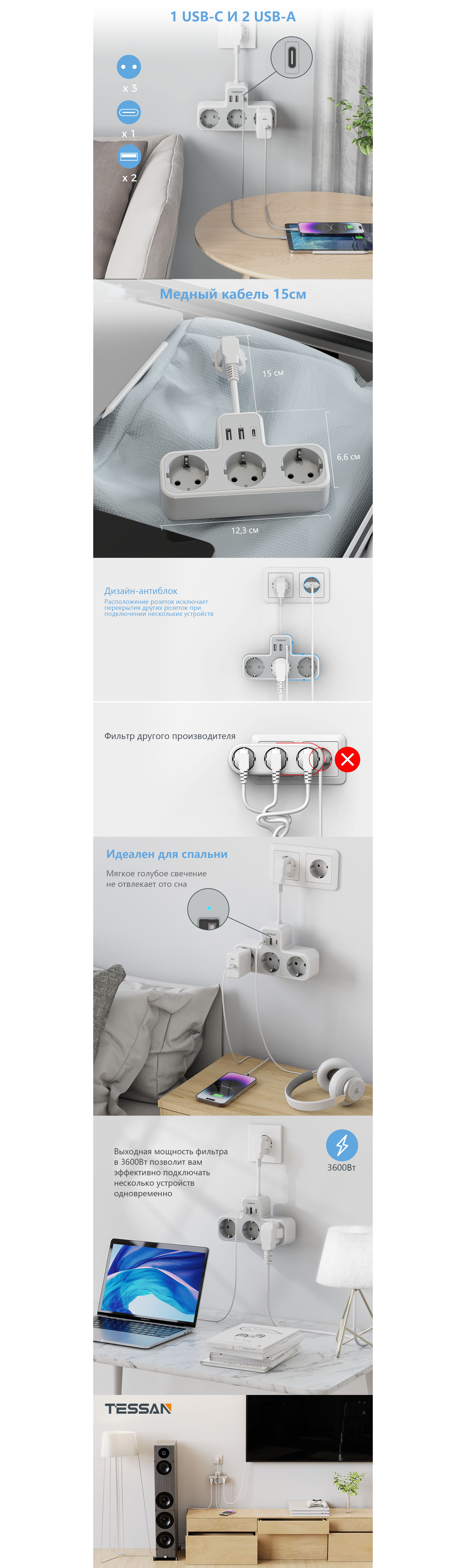 Сетевой фильтр TS-323X-C с 3 розетками 220В, 2 USB и 1 USB Type-C портами, на гибком и прочном встроенном 15см кабеле.