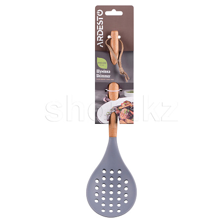 Силиконовая шумовка с деревянной ручкой размером 32 × 8.5 см. Эргономичная форма позволяет уменьшить нагрузку на руки во время работы. Термостойкая – выдерживает температуру до 180 °C. Мыть в посудомоечной машине не рекомендуется.
