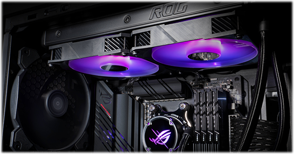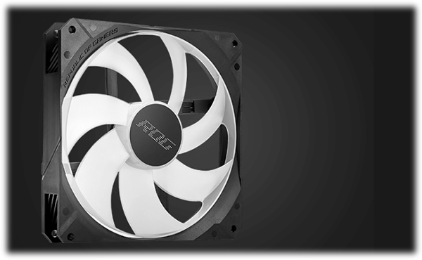 Вентиляторы радиатора ROG специально настроены для обеспечения оптимальной производительности радиаторов серии ROG Strix LC II. Вентиляторы производят 102.3 кубических футов в минуту / 3.1 мм H2O, что обеспечивает исключительную эффективность охлаждения.