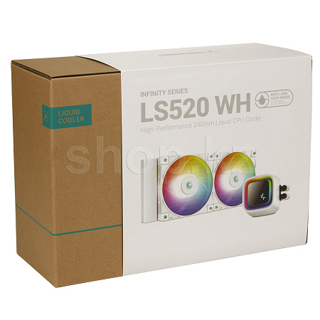 Жидкостный кулер премиум-класса DeepCool LS520 для процессоров обеспечивает максимальную эффективность охлаждения и низкий уровень шума благодаря 240-мм радиатору, двум вентиляторам FC120 A-RGB PWM и зеркальной крышке с эффектом бесконечности.