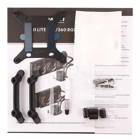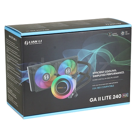 Необслуживаемая СЖО для процессора LIAN LI GALAHAD II LITE 240R имеет защиту от протечек. Отвод тепла от радиатора обеспечивают два вентилятора диаметром 120 мм с диапазоном скорости вращения от 300 до 2500 об/мин. В комплект входит термопаста, предназначенная для нанесения на крышку процессора перед установкой водоблока.