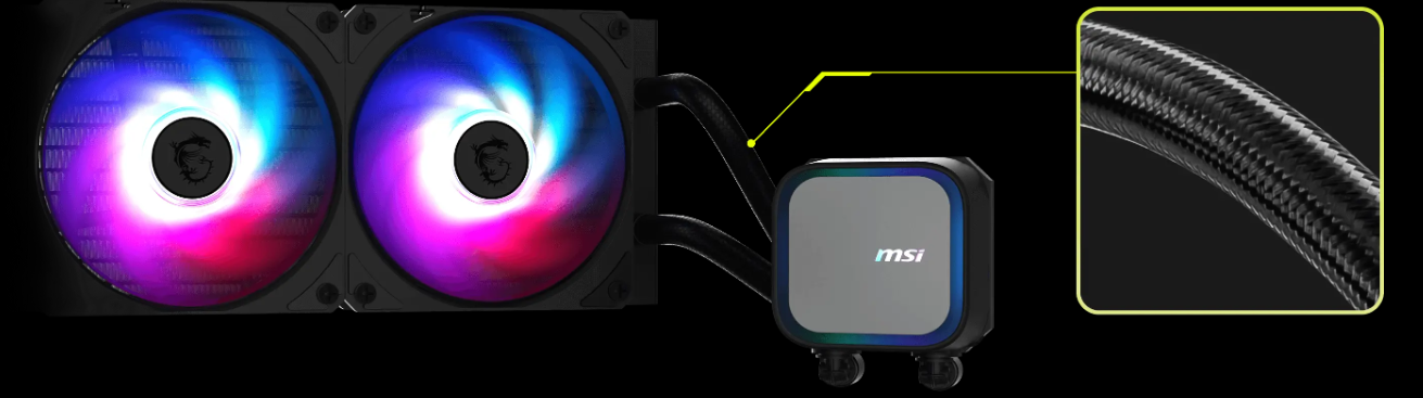 В системах охлаждения серии MAG CORELIQUID A13 используются трубки из синтетического каучука в нейлоновой оплетке. Этот материал известен своей гибкостью, устойчивостью к старению, колебаниям температуры и коррозии, поэтому он хорошо предотвращает испарение охладителя и удобен в эксплуатации.