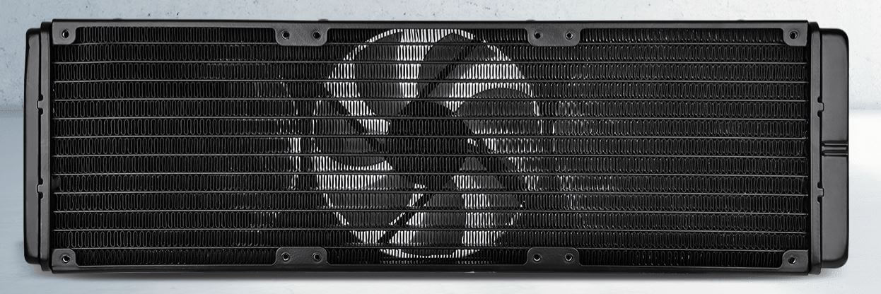 Большой размер радиатора позволяет хладагенту быстро охлаждаться проходя через его протоки. Штатно установлены 3 вентилятора размером 120 мм с одной стороны. Для усиления воздушного потока, опционально можно установить еще 3 вентилятора на обратной стороне.