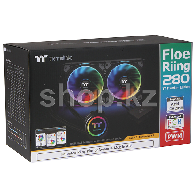 Floe Riing RGB 280 TT Premium Edition - первая в мире СВО из серии "все в одном" имеющая RGB подсветку водоблока и охлаждающих вентиляторов. В качестве последних используются 2 вентилятора Riing Plus RGB размером 140мм, имеющие непревзойденный уровень эффективности и высокое качество исполнения.