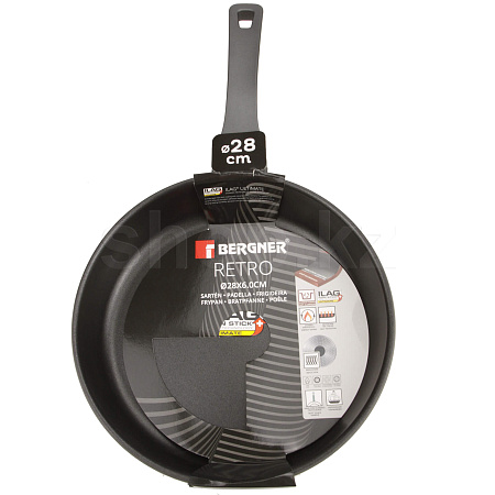 Сковорода Bergner Retro BG-30734-NP из литого алюминия, размером 28 x 6 см. Внутреннее трехслойное покрытие ILAG ultimate. Эргономичная ручка с покрытием soft touch.
