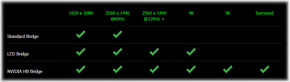 Данный мост поддерживает двухканальный режим SLI, который обеспечивает удвоенную пропускную способность по сравнению с предыдущей графической архитектурой NVIDIA. Повышенная скорость передачи данных будет особенно полезной при использовании SLI-связок для игры в сверхвысоких разрешениях.