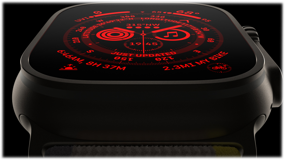 Дисплей Always-On Retina имеет яркость 2000 нит в пике яркости и в два раза ярче, чем у других часов Apple Watch. На большом дисплее больше места для показателей тренировок и детализированных циферблатов. Лицевая сторона Wayfinder позволяет вращать цифровую головку, чтобы активировать ночной режим для лучшей видимости в условиях недостаточного освещения.