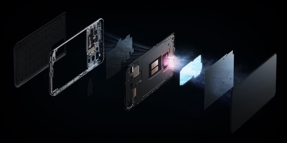 Смартфон оснащен крупной "испарительной камерой", объем которой достигает 1729.8 кв.мм. В сочетании со сверхбольшим радиатором площадью 13217 кв.мм, покрывающим 100% основных источников тепла, это обеспечивает эффективное охлаждение смартфона. Благодаря данной технологии смартфон будет меньше нагреваться даже во время долгой работы или во время игры с высоким уровнем графики.