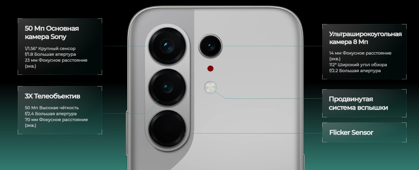 Негізгі үштік камера: 50 МП + 50 МП + 8 МП сізге егжей-тегжейлі фотосуреттер, керемет портреттер және кең пейзаждар жасауға мүмкіндік береді. 50 МП алдыңғы камера селфи мен бейне қоңыраулар үшін тамаша. 4K дейін бейнежазбаны қолдау әр сәтті егжей-тегжейлі сақтауға мүмкіндік береді.