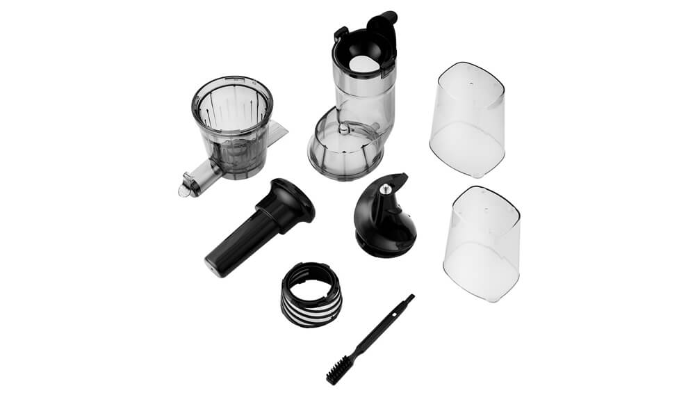 Все комплектующие соковыжималки выполнены из надёжных материалов. Чаша, крышка и толкатель сделаны из прочной пищевой пластмассы. Фильтр - из нержавеющей стали, а шнек отлит из ультрапрочного пластика, способного выдержать большие нагрузки при работе.