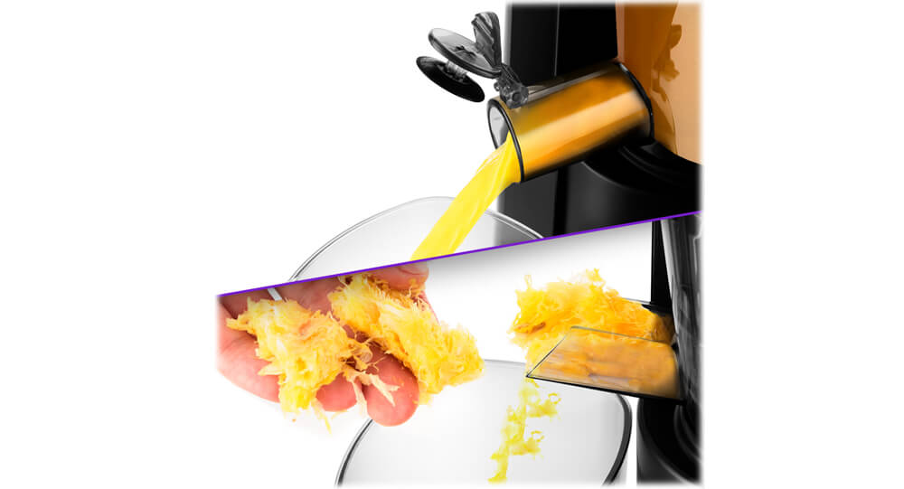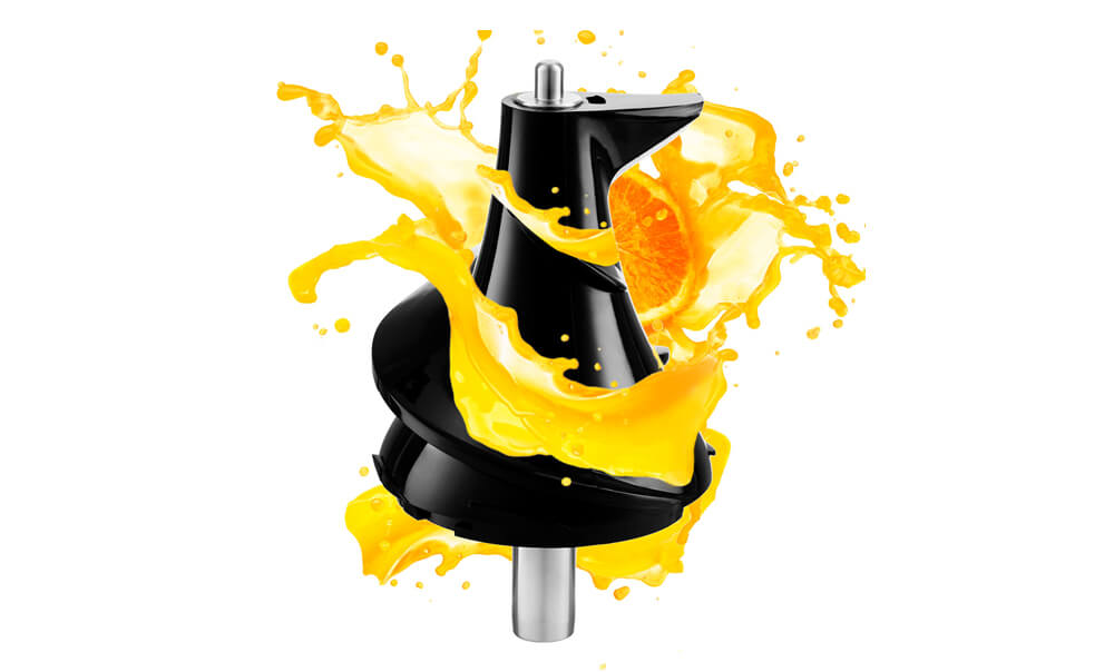 Ультрапрочный спиралевидный шнек-пресс захватывает, дробит и прессует плоды, подающиеся к нему через горловину, а затем продавливает мякоть через фильтр, отделяя жмых от сока в считанные секунды.