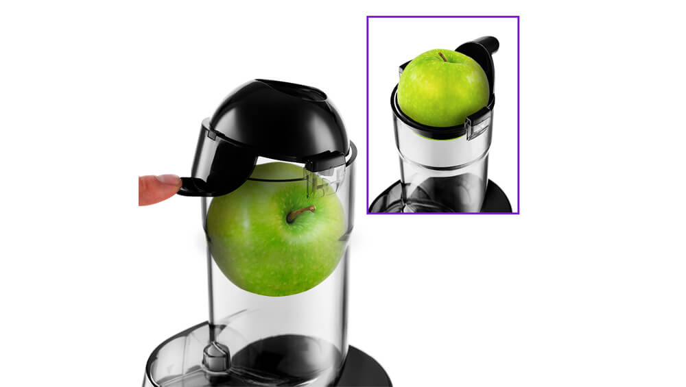 Широкая горловина позволяет загружать многие фрукты и овощи целиком, не нарезая их предварительно на части!