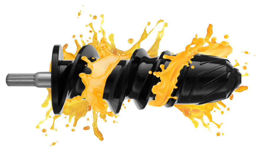 Ультрапрочный спиралевидный шнек-пресс захватывает, дробит и прессует плоды, подающиеся к нему через загрузочный лоток, а затем продавливает мякоть через фильтр, отделяя жмых от сока в считанные секунды. Подача жмыха идёт в отдельную ёмкость.