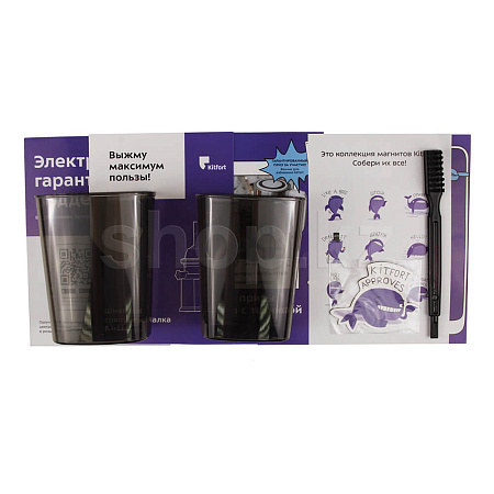 Он сделан не из нержавеющей стали в виде сетки, а из пластмассы с прорезями. Такой фильтр легко мыть. Для мытья фильтра в комплекте прилагается щёточка с жёстким ворсом, помогающая вычистить остатки мякоти.