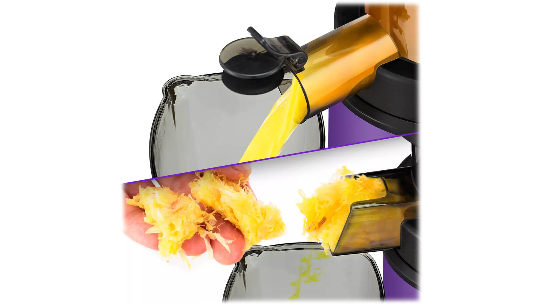 Ультрапрочный спиралевидный шнек-пресс захватывает, дробит и прессует плоды, подающиеся к нему через горловину, а затем продавливает мякоть через фильтр, отделяя жмых от сока в считанные секунды.