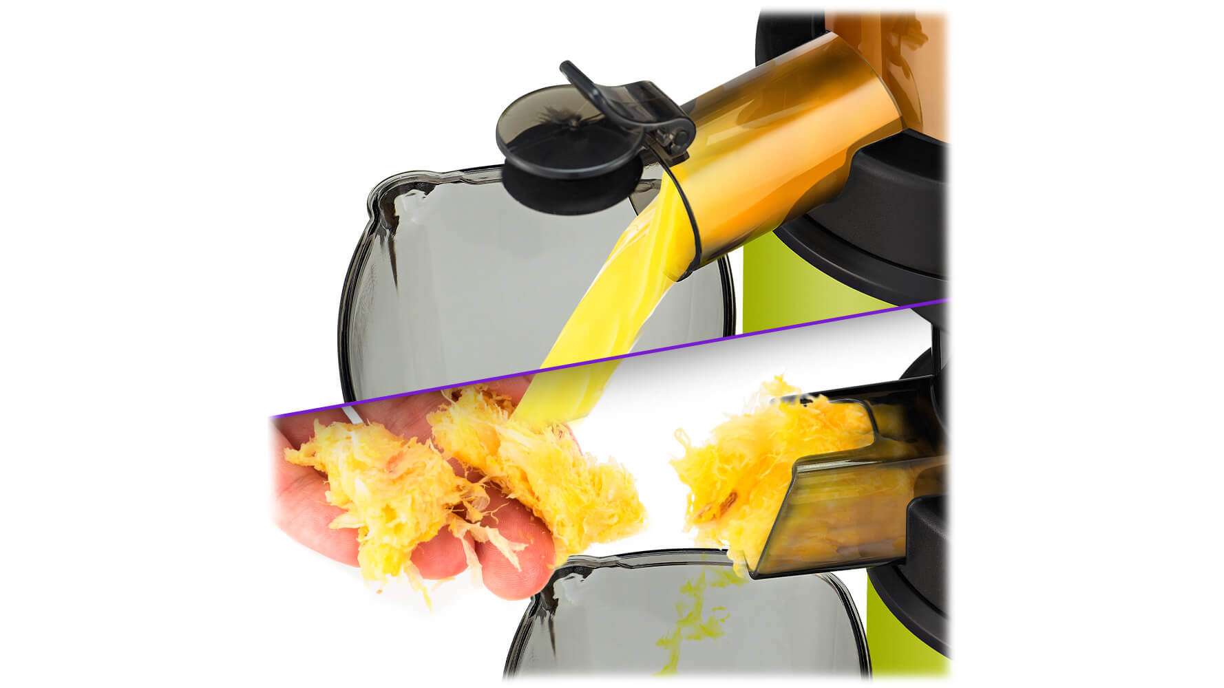 Ультрапрочный спиралевидный шнек-пресс захватывает, дробит и прессует плоды, подающиеся к нему через горловину, а затем продавливает мякоть через фильтр, отделяя жмых от сока в считанные секунды.