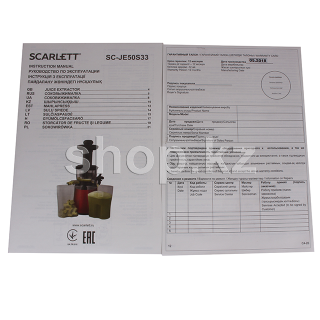 Шнековая соковыжималка SCARLETT SC-JE50S33 осуществляет отжим на низких скоростях и позволяет получить насыщенный сок даже из ягод и зелени. Живой сок холодного отжима без расслоения сохраняет более 80% витаминов, минералов и энзимов! Двигатель представляет собой однофазный индукционный переменного тока. Прибор оснащён одной скоростью работы и режимом "реверс". Также SC-JE50S3 дарит возможность получения сока разной чистоты: от «с мякотью» до прозрачного (чистота до 96%)! Все внутренние части соковыжималки разбираются и моются под водой. Ёмкость для сока, емкость для жмыха и щёточка для очистки в комплекте. А низкий уровень шума делает работу прибора комфортной для окружающих.
