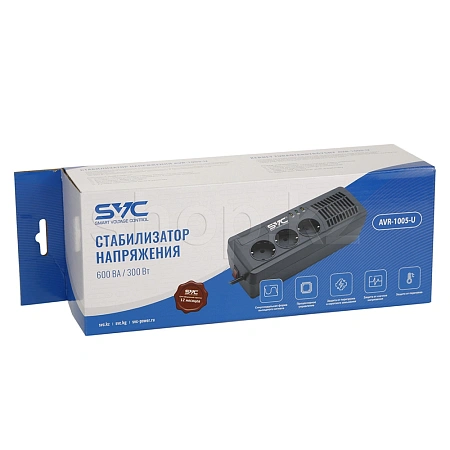 Стабилизатор напряжения SVC AVR-1005-U - устройство, получающее питание от городской сети и выдающее на своём выходе уже отфильтрованное, стабильное напряжение, не зависящее от скачков напряжения на входе. Часто случающиеся скачки напряжения способны вывести из строя блоки питания, электродвигатели, трансформаторы электрических устройств, но использование стабилизатора надёжно защитит ваше дорогостоящее оборудование.