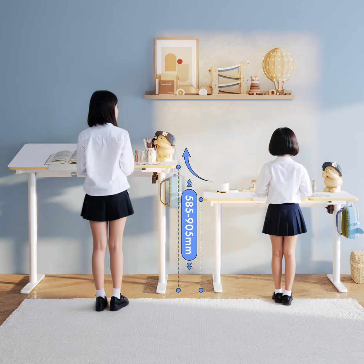 Электрический регулируемый по высоте стол SK2 плавно поднимается и опускается от 58,5 до 90,5 см. Высота стола может регулироваться в соответствии с ростом ребенка, начиная с детского сада и начальной школы и заканчивая средней и старшей школой, что делает его подходящим для длительного использования.