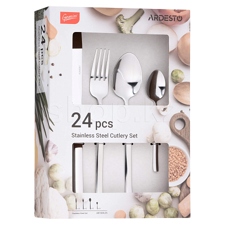 Набор столовых приборов из 24 предметов. Включает в себя: ложки, вилки и ножи. Приборы выполнены из нержавеющей стали с зеркальной полировкой.