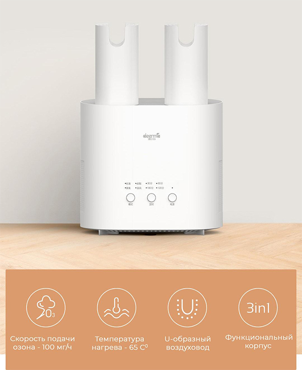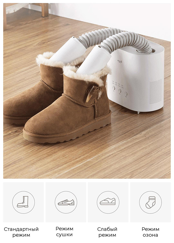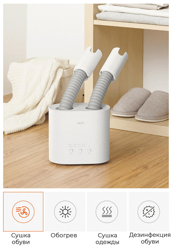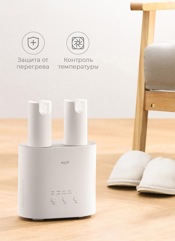 В летний сезон ноги быстро потеют, что приводит к неприятному запаху и возникновению многочисленных грибковых заболеваний. Для предотвращения данных проблем, новая модель Deerma Shoe Dryer не только сушит обувь, но и проводит антибактериальную обработку.