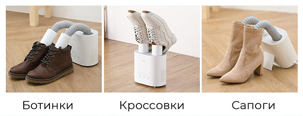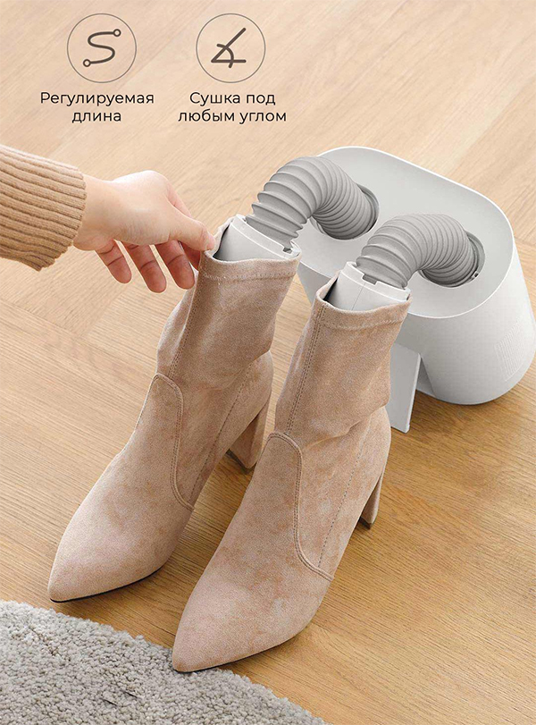 Вентиляторы и обогреватели способны высушить только верхнюю часть обуви, что негативно отражается на состоянии изделий из кожи и эластичных материалов. Шланги подачи воздуха Deerma Shoe Dryer могут растягиваться до 27 см, благодаря чему Вы можете сушить обувь разной высоты и формы.