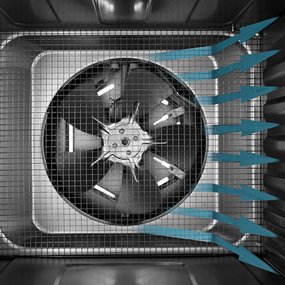 Сушилка оборудована большим мощным вентилятором, что обеспечивает равномерный горизонтальный обдув всех поддонов. Поток воздуха направлен горизонтально, так что запахи продуктов с разных поддонов не смешиваются.