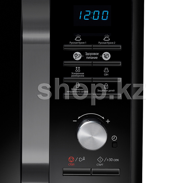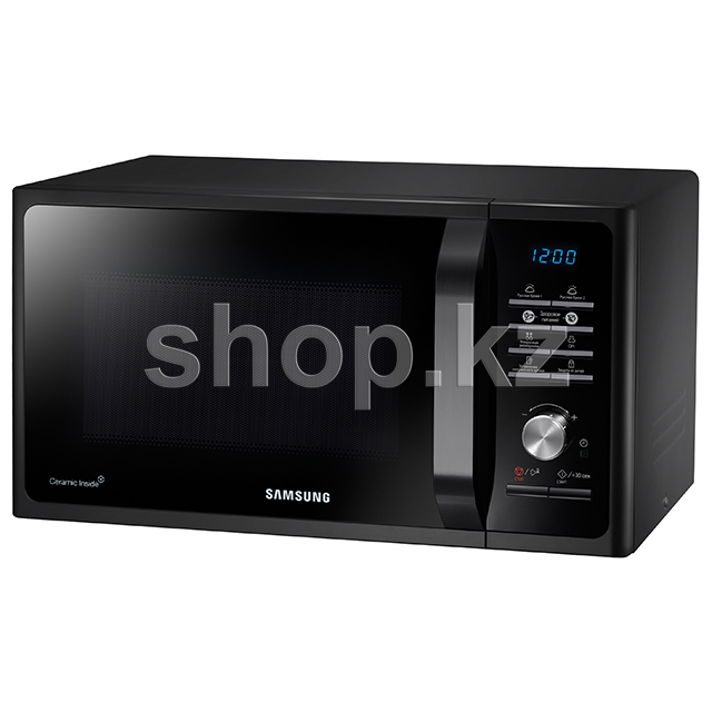 Микроволновая печь MS23F302TAK со стильным дизайном, лицевой панелью из черного стекла, красивым дисплеем синего свечения и серебристым переключателем станет украшением вашей кухни.