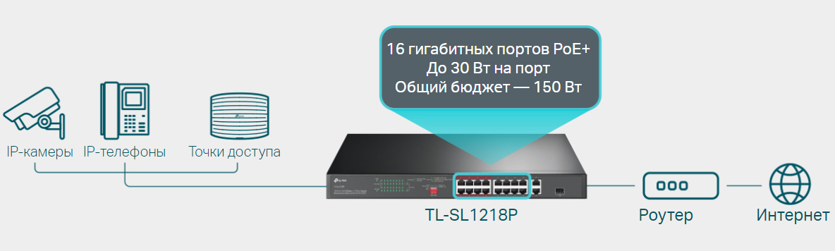 Благодаря соответствию стандарту PoE+ 802.3af/at каждый порт PoE поддерживает до 30 Вт, а общий бюджет PoE 150 Вт для 16 портов PoE+ открывает широкий ряд возможностей, например, создание видеонаблюдения для офисов, общежитий и малого бизнеса. TL‑SL1218P полностью совместим с IP‑камерами, точками доступа, IP‑телефонами, компьютерами, принтерами и не только.