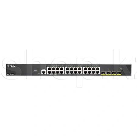 Управляемый коммутатор DGS-1250-28X, оснащенный 24 портами 10/100/1000Base-T и 4 портами 10GBase-X SFP+, поддерживает технологию D-Link Green и расширенные функции управления и безопасности, обеспечивая высокую производительность и масштабирование сети. Функции управления включают SNMP, управление на основе Web-интерфейса и интерфейс командной строки (CLI).