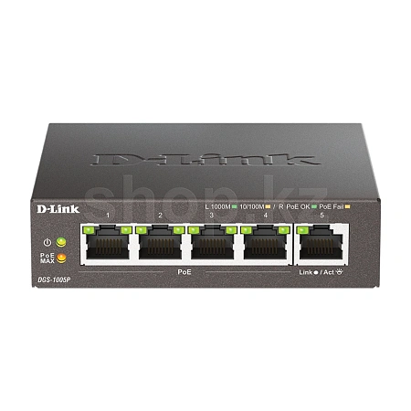 4 порта DGS-1005P поддерживают стандарт IEEE 802.3at PoE. Каждый порт PoE подает питание мощностью до 30 Вт при общем бюджете коммутатора 60 Вт, что позволяет пользователям подключать к DGS-1005P устройства, совместимые со стандартом 802.3at. Это позволяет размещать оборудование в труднодоступных местах вне зависимости от расположения электрических розеток и минимизировать прокладку кабеля.