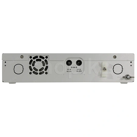 PoE-коммутатор имеет 8 гигабитных портов RJ45 с различными вариантами питания на выходе: автоопределение 802.3af/at PoE/PoE+ и Passive PoE. Четыре SFP-порта обеспечивают возможность оптоволоконного подключения для поддержки восходящих соединений до 1 Гбит/с. На задней стороне корпуса есть вторичный разъём DC Jack, который поддерживает источник питания 48–57 В — например, MikroTik 48V2A96W (приобретается отдельно).