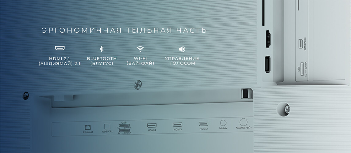 Благодаря Chromecast и Wi-Fi 5G можно транслировать контент с других устройств на экран телевизора c максимальной скоростью. Порт HDMI 2.1 даст возможность получить максимум от вашей Playstation, а Bluetooth - подключить ваш любимый джойстик или наушники.